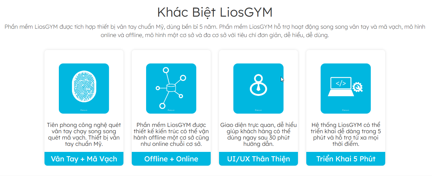 LiosGYM là sản phẩm tiên phong tại Việt Nam tích hợp công nghệ quét vân tay và mã vạch để kiểm soát ra vào. Với hơn 500 tính năng chuyên sâu, LiosGYM đáp ứng linh hoạt từ các phòng tập Gym, Yoga, Spa nhỏ đến các chuỗi cơ sở quy mô lớn.
